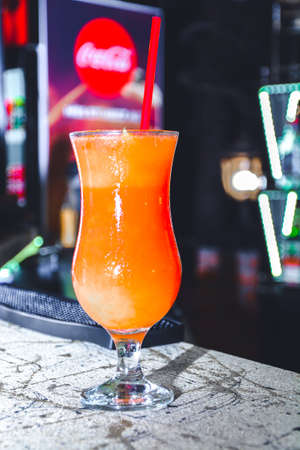 Fresh glass of tropical cocktail with juice on the background of the bar counter. Cocktail glass with ice and festive lights in the background.