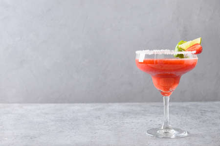 Cold strawberry margarita cocktail with ice, lime and fresh berries in margarita glass, light grey background copy space above