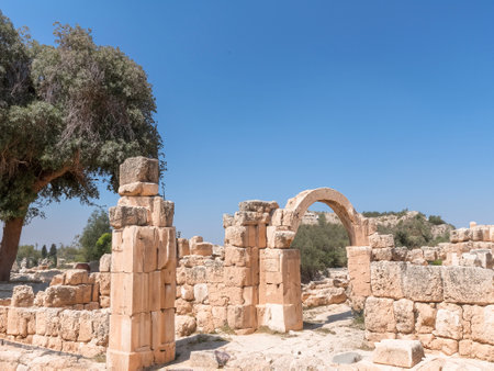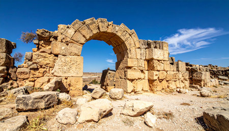 Ancient stone archway ruins with scattered rocks under a bright blue sky. Clear details and vibrant colors enh...