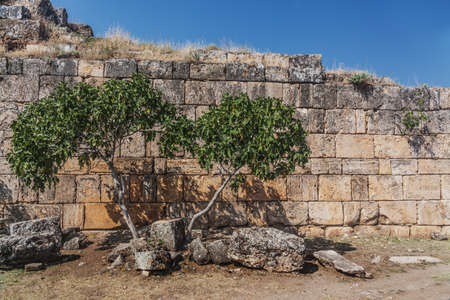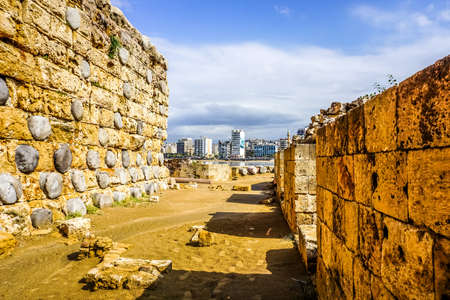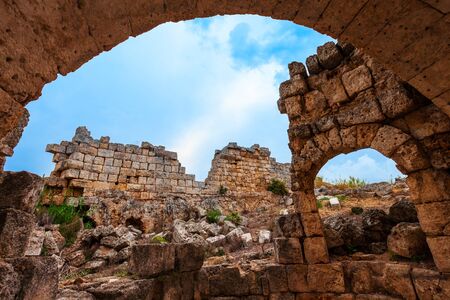 Awesome view of the ancient city walls in Side, Turkey. The amazing ruins are a popular tourist attraction of the world.