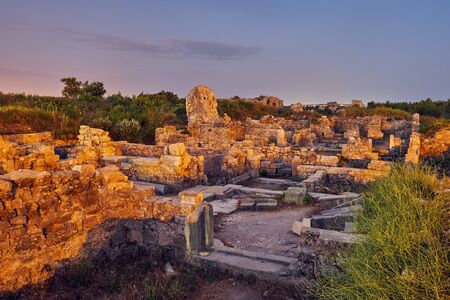 Ancient city of Perge near Antalya Turkey. Ancient Ruins of Rock and Stone in the evening sun.