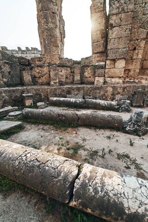 Columns of elements of buildings, parts of the ruins and antiquity of the ancient. City of Hierapolis, Turkey