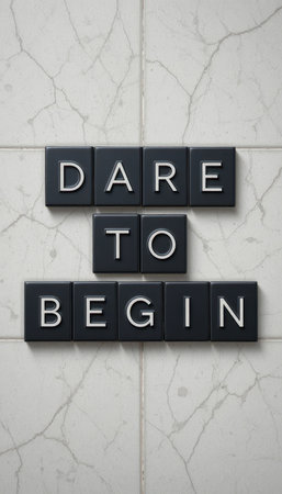 A marble background features the motivational phrase Dare to Begin in sleek lettering. This composition evokes inspiration and encourages personal growth and ambition.