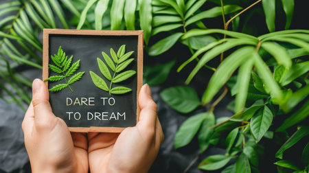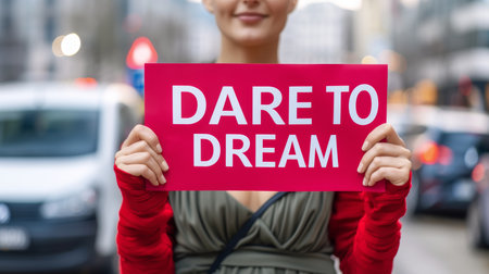 Motivational success concept woman holds dare to dream sign on abstract blurred background