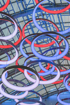 Interior of modern office building with blue ceiling lights. Abstract background.