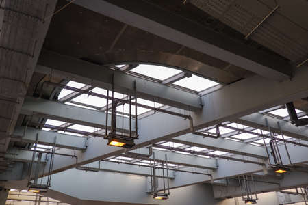 Ceiling in big hall with lamps and steel girders and pipes and air vents for ventilation system