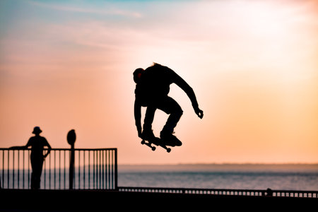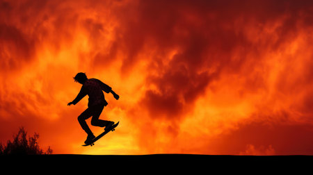 Silhouetted skateboarder launching into a jump at sunset, surrounded by a vibrant orange sky and wispy clouds, capturing the spirit of freedom