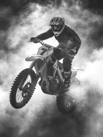 Dynamic motocross rider performs thrilling jump through dense smoke in intense black and white setting