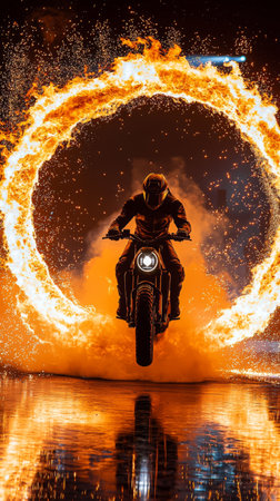 Stunt rider performs thrilling motorcycle trick through blazing fire ring at night event