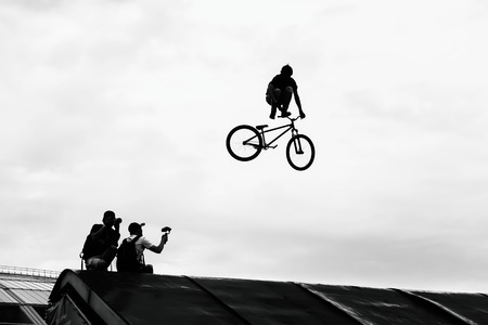 Extrem Sport. BMX bike jumping in sky on high speed, black and white silhouette.