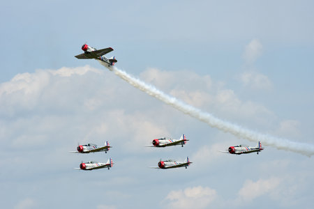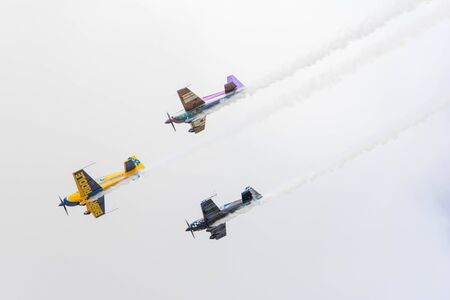 Leszno, Poland - June 16 2023: Antidotum Airshow Leszno 2023 and acrobatic shows full of smoke of The Fyling Bulls Acrobatic Team on a cloudy sky
