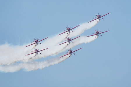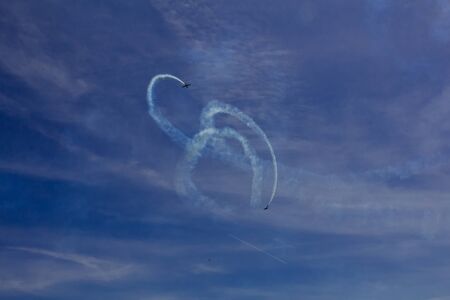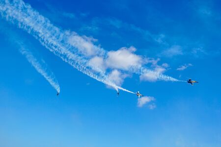 Aerobatics, air show. Aircraft team performing in the sky with white lines and blue sky