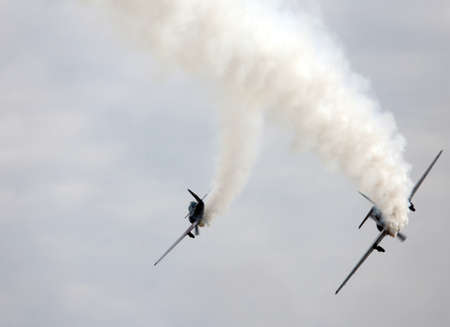 Thiene, Vicenza - Italy. 26th July, 2015: important air show called FlighThiene in Thiene Airport near Vicenza City in Northen Italy with many historical and modern airplanes. Two aircraft perform amazing aerobatics with smoke
