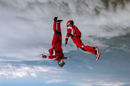 Skydiving photo. Two sports parachutist build a figure in free fall. Extreme sport concept.