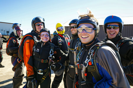 Smiling professional skydivers forming a group in the landing zone, with calm expressions. Adults preparing for the jump. Generative AI