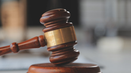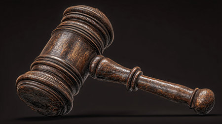 The judge's wooden gavel lies on the table in the courtroom, bringing order, marking a decision or ruling. Hammer for auctions. Generative AI