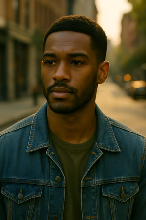 Portrait of a man wearing a denim jacket captured in warm natural light.