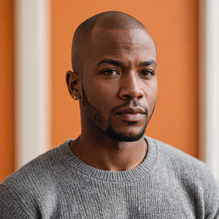 Distinguished African American Man in Grey Sweater Against Orange Background
