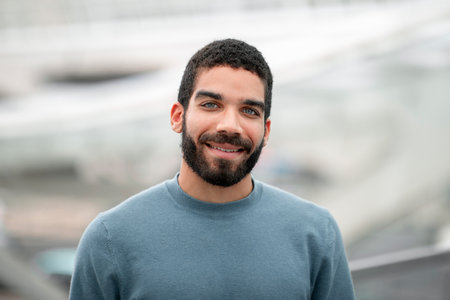 Cheerful Arabic Man Posing Smiling Standing In Modern Building Indoors