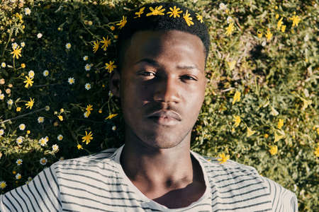 Portrait of young african american man looking at camera in sunlight