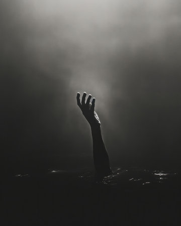 Hand of a drowning man in the dark with fog.