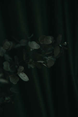 Branch of eucalyptus on dark green background, gloomy photo of the plant