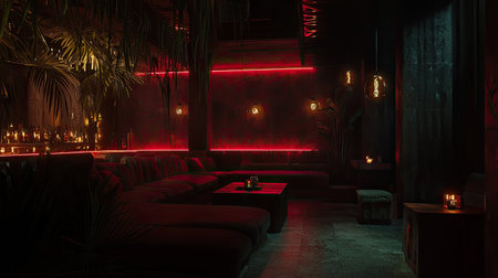 A cozy lounge setting featuring neon lights and tropical plants, creating a relaxing atmosphere ideal for evening gatherings, drinks, and intimate conversations.