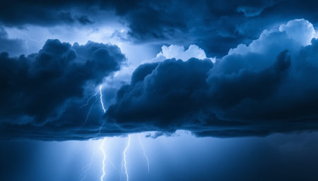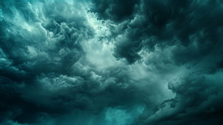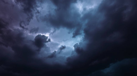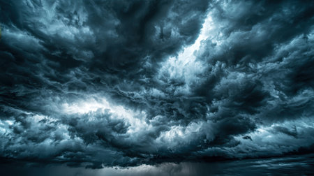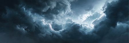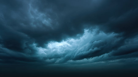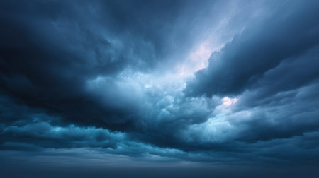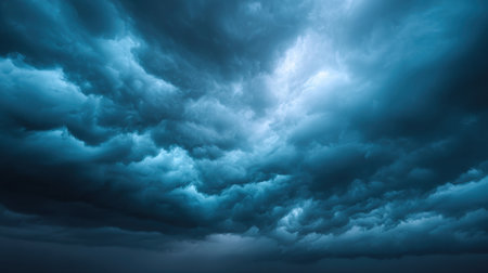 A captivating image of dark stormy clouds fills the sky with shades of blue and gray, evoking a sense of power and beauty in nature.