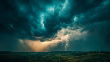 Thunderstorm over green landscape with striking lightning, dramatic sky. Natures power and weather phenomena concept