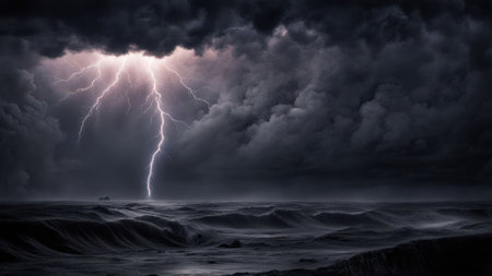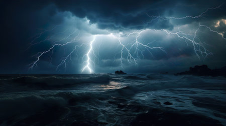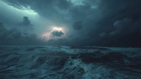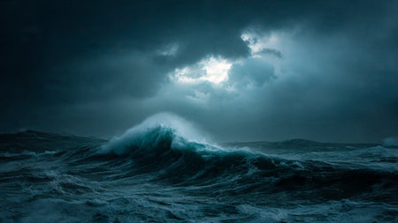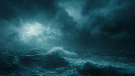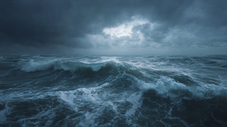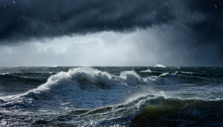 Stormy weather engulfs the ocean as dark clouds loom overhead. Waves churn violently, creating a striking contrast against the deep blue water. The atmosphere feels tense and powerful.