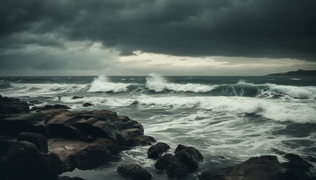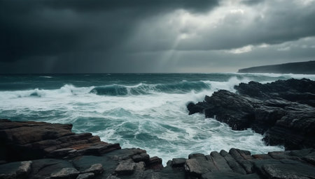 Breaking waves crash against rocky coastline, dramatic beauty generated by artificial intelligence