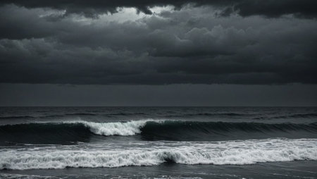 Moody dark ocean waves under stormy sky with dramatic clouds.