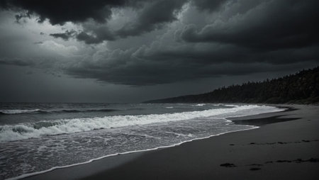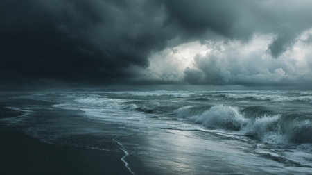 An empty beach awaits as storm clouds gather above, casting a dark shadow over the restless waves crashing on the shore, signaling an approaching storm.