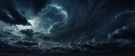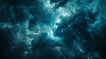 A captivating scene of a powerful thunderstorm showcases dark, swirling clouds and striking lightning, creating a dramatic atmosphere. The intense display of nature's power evokes a sense of awe and majesty.