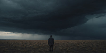 AI Generated. A somber image depicting a lone individual on the brink of an expansive, desolate field, under a gloomy sky, evoking feelings of isolation and melancholy, symbolizing depression