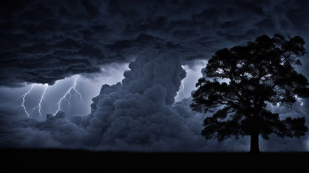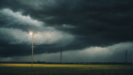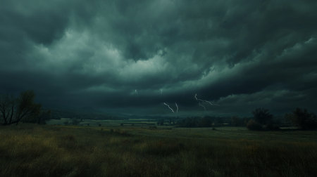 Dark clouds swirling over a rural landscape, with distant thunder and lightning generative ai