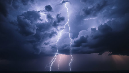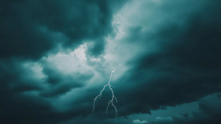 A striking image of lightning illuminating a dark, stormy sky. The clouds loom ominously, capturing the raw power and beauty of nature's fury. Perfect for weather themes or atmospheric backgrounds.