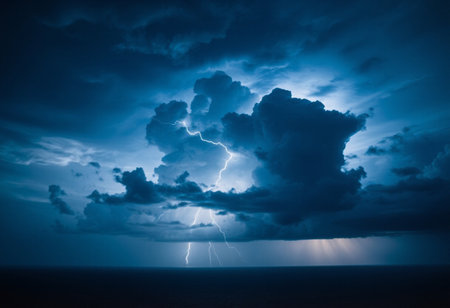Stormy sky with lightning and thunderclouds. Abstract background.