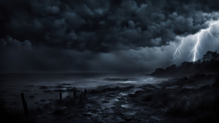A mass of dark, swirling clouds dominate the sky, illuminated by occasional flashes of lightning. The atmosphere is charged with electricity as a powerful storm approaches.