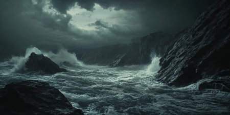 A dynamic stormy sea with towering waves crashing against a rocky coastline. The dark clouds and dramatic lighting create an intense and powerful atmosphere.