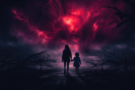 Sinister Embrace: Mother and Child Amidst Ominous Trees