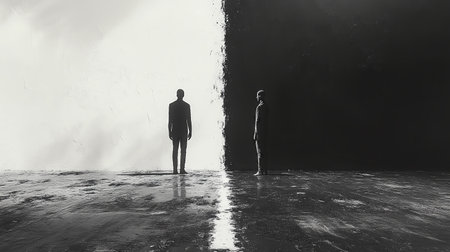 Two human silhouettes, one dark and one light, stand facing each other on a sharply divided black-and-white surface, symbolizing duality and contrast.