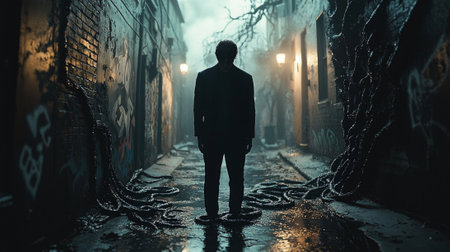 male individual stands narrow alleyway appearing distressed as dark shadows loom him reflecting emotional exhaustion creepy environment dim streetlights.
