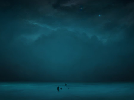 A silhouetted person stands on a small island, framed by dramatic, cloudy skies and a large, pale light source. The tranquil scene features a mirrored reflection in the still water below. The composition utilizes cool colors and soft textures. Suitable for conceptual art, design projects, and illustrative purposes.