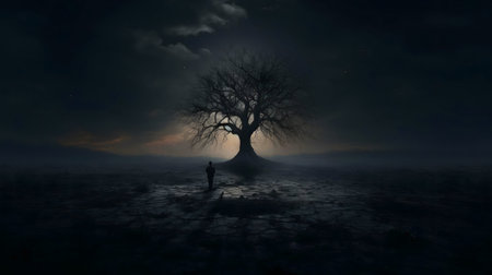 A lone figure stands before a large, leafless tree in a dark and desolate landscape. The moon shines faintly through the night sky.