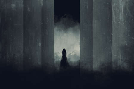 A lone woman in a dress. Silhouetted in a dark corridor. With a glowing light behind.