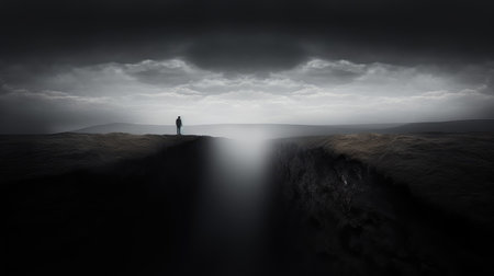 A lone figure stands on the edge of a deep crack in the barren ground as dark clouds loom overhead. The scene captures a sense of isolation and mystery during twilight.