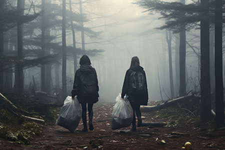 An AI generated illustration of two female hikers with backpacks walking through a foggy forest with trash bags