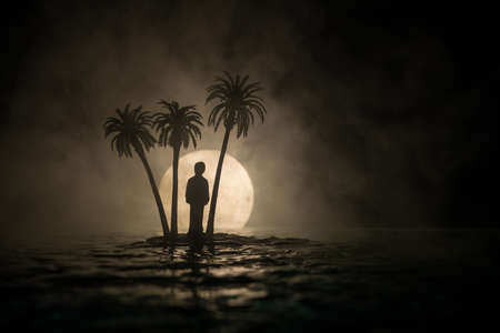 Romantic night scene. Fantasy night landscape with little island with palms and full moon over sea. Creative table decoration. Silhouette of a man standing on little island. Selective focus.