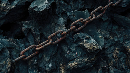 A close-up image featuring a rusty chain link lying among dark, textured rocks. The contrast between the metal and stones showcases an industrial feel, perfect for themes of strength and durability.